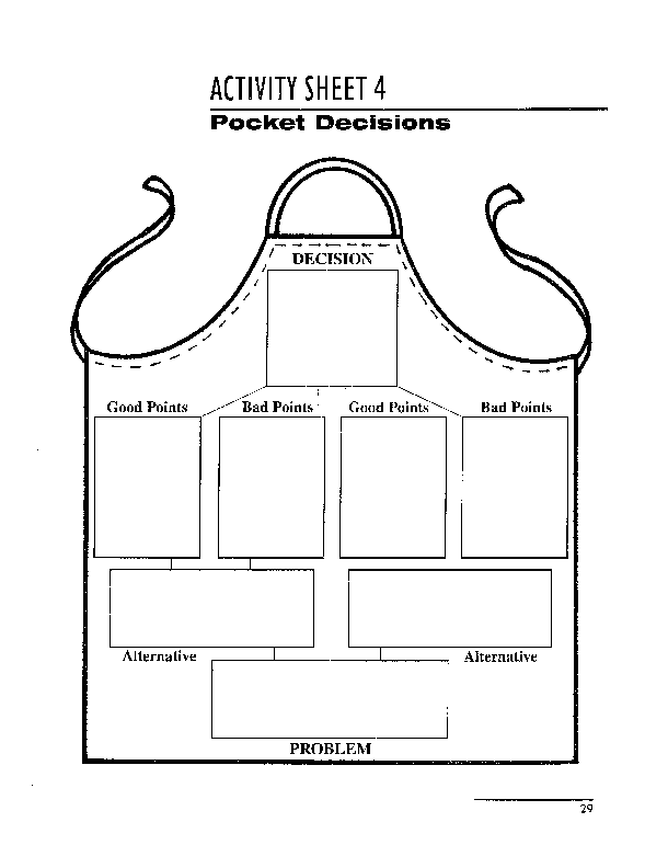 1. To reinforce the "how" of decision making, introduce Pocket Decisions, Activity Sheet , as a helpful way for your child to examine Penny's problem. Using the apron, emphasize that the process can be used for many problem-solving situations. Explain that when a choice is made, the most favored alternative not chosen is the opportunity cost.